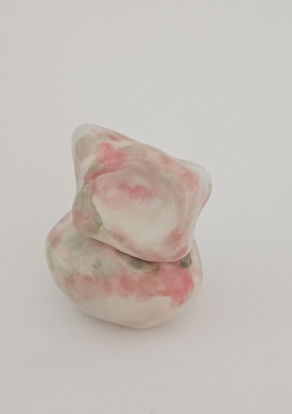 Two ceramic sculptures (2025) made by eight ceramic pieces (Like Strawberries, 2024). White clay, engobe, crystal.